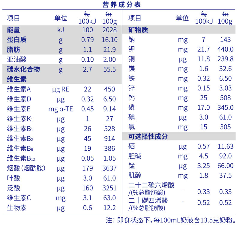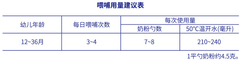 依照喂哺用量建議表,加入正確份量(平勺)的奶粉,請勿刻意壓平量勺。